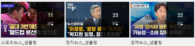 이번 포스팅에서는 pytorch 기반으로 만들어진 fast.ai라는 딥러닝 라이브러리를 이용해 빠르게 CNN 분류모델을 적용해보는 것이 이번 포스팅의 주요 내용입니다. 분류 목적은 유튜브 뉴스 썸네일을 이용하여 카테고리(스포츠, 경제, 정치)를 예측하는 것입니다. 카테고리별로 유튜브 재생목록을 만들어 샘플을 각각 50여개씩 수집했습니다. 코드 실행 환경은 아래와 같습니다. 언어: Python 편집기: Google Colab(무료 버전, 하드웨어 가속기: GPU) 파일 경로 같은 것들이 모두 Google Colab을 가정하고 작성되어 Local에서는 실행이 어려우실 수 있습니다. 소스코드: https://drive.google.com/file/d/1k3m4yQ3DNU1epmOxa9Se8gtmQ0iAvuKp..